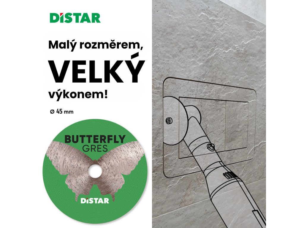 Precizní diamantový řezný kotouč DISTAR Butterfly o průměru 45 mm se stopkou v balení je ideálním nástrojem pro přesné řezání keramických a porcelánových dlaždic do tloušťky 12 mm. Díky velmi tenké řezné hraně 0,6 mm poskytuje čisté, hladké řezy bez praskání a otřepů – ideální při detailních úpravách nebo práci v omezených prostorech. Určený pro řezání za mokra!
