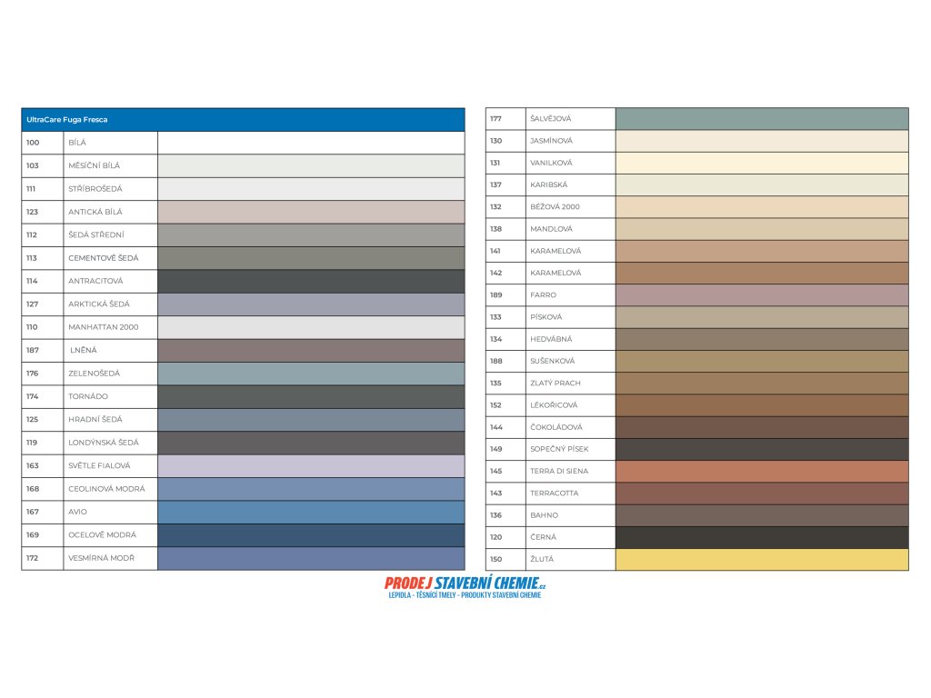 UltraCare Fuga Fresca je nátěrová hmota na bázi akrylových pryskyřic ve vodní disperzi s obsahem polymerů, která díky svým výjimečným vlastnostem a své vynikající krycí schopnosti umožňuje dosáhnout jednotného barevného vzhledu a omezení nasákavosti povrchu spáry. Díky tomu se ošetřené plochy snadno udržují.