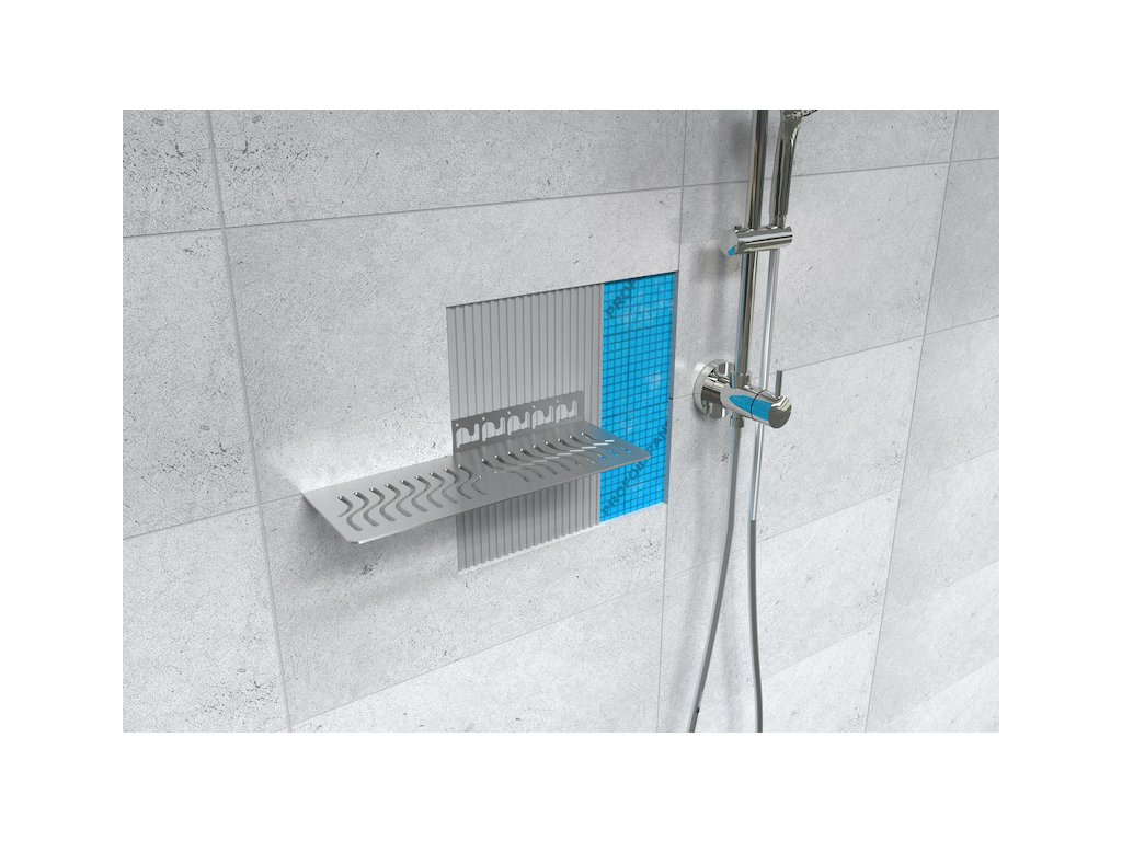 Polička je určena k instalaci současně s obkladem, takže je její montáž prováděna přímo během lepení dlaždic na stěnu. Díky tomu po dokončení prací zůstává polička v jedné rovině s obkladem a nepůsobí rušivě. Je ideální pro odkládání sprchových gelů, šamponů a dalších koupelnových doplňků.